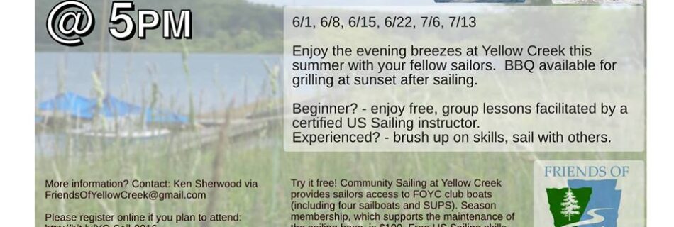 Try it free! Community Sailing at Yellow Creek provides sailors access to FOYC club boats (including four sailboats and SUPS). Season membership, which supports the maintenance of the sailing base, is $100. Free US Sailing skills check-out available.